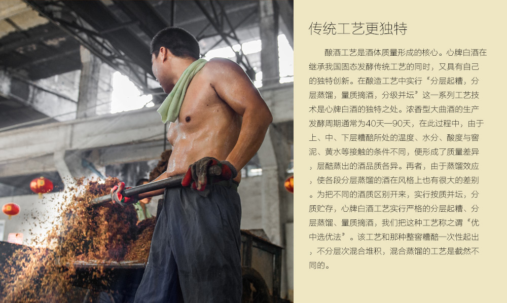 濃香型心酒的釀制過程中將高溫大曲和中溫大曲按比例混合使用。它對形成心酒的典型風(fēng)格起著關(guān)鍵的作用。高溫大曲中有耐高溫細(xì)菌,高含量的酸性蛋白酶,種類繁多的微生物種,復(fù)雜的酶系,呈香呈味物質(zhì)豐富,它是心酒呈現(xiàn)香氣濃郁、復(fù)合香較好的重要條件。低溫入窖與緩慢發(fā)酵是心酒生產(chǎn)的工藝控制點, 有利于醇甜物質(zhì)的形成,有利于控酸產(chǎn)酯,有利于控制高級醇的形成,有利于加速新窖老熟。入池溫度的高低是正常發(fā)酵的首要條件。如果入池溫度過高,會使糧糟糖化發(fā)酵升溫快,打擾糖化與發(fā)酵作用的協(xié)調(diào);糖化速度高于發(fā)酵速度,造成糖分的積累;給大量產(chǎn)酸菌的生長、繁殖和代謝創(chuàng)造了一個良好環(huán)境,造成酒醅酸度升高,影響白酒的質(zhì)量,更不利于下排配料。同時,由于糖分消耗過多,變成酸味物質(zhì),也會降低白酒產(chǎn)量。若入池溫度過低,也不利于有益釀酒微生物的生長繁殖,使釀出的白酒香味短、酒味淡、產(chǎn)量低等。因此,發(fā)酵規(guī)律依然遵循“前緩、中挺、后緩落”。