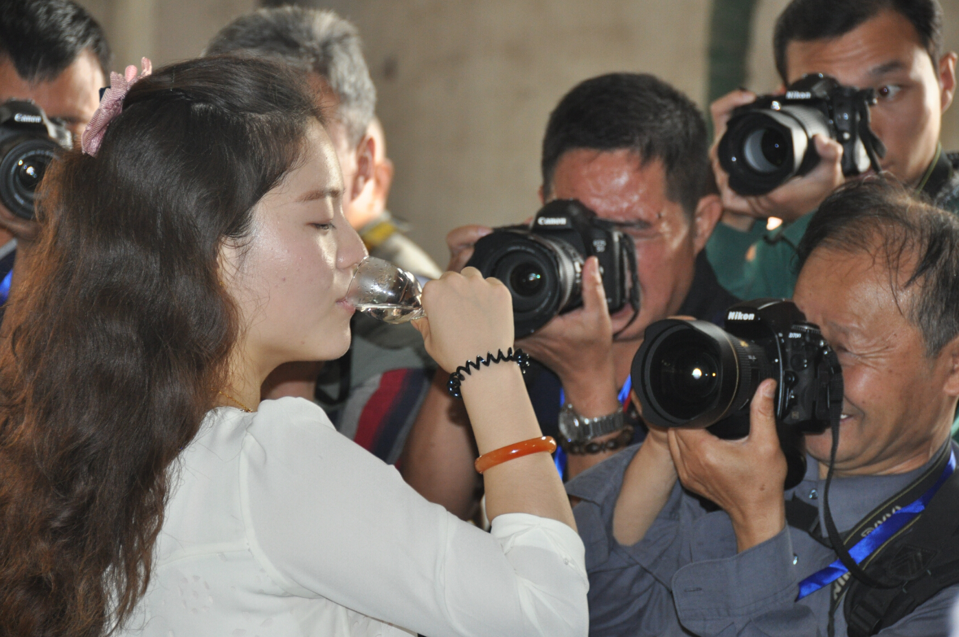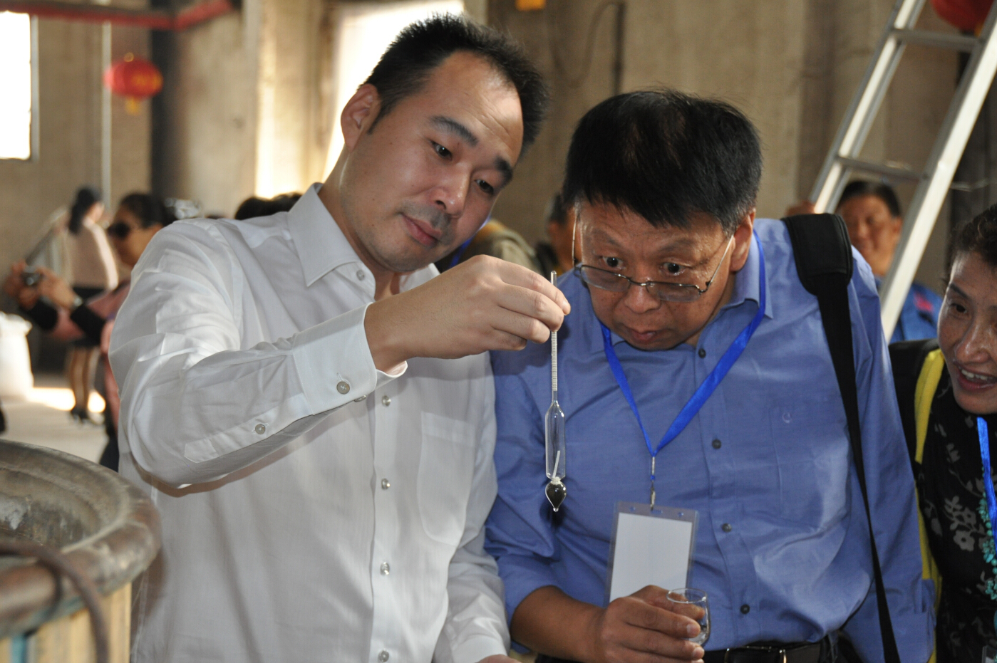 參賽的各位朋友們在公司講解員的介紹和引導下,了解了心酒的發展歷程,來到了糧食酒生產車間。生產車間熱氣騰騰的工作場面,調動起了早已按捺不住的創作沖動,紛紛拿起手中的長槍短炮拍個不停。他們尋找不同角度,努力拍到自己想要的畫面,或站、或蹲、或趴在地上,或攀上高處,或讓工人放慢操作速度,或讓我們的美女講解員臨時客串起了“模特兒”,就連董事長也未放過,或合影,或當講解員,或端起酒杯一起品嘗熱騰騰的原酒。