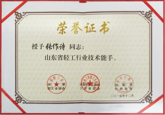 獲“山東省輕工行業(yè)技術(shù)能手”榮譽(yù)稱號(hào)
