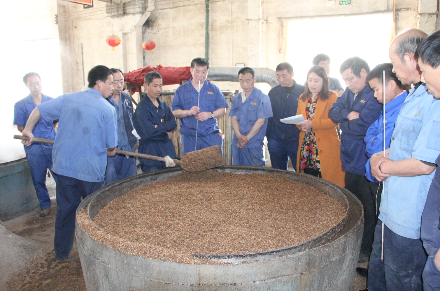 為了讓酒醅受熱均勻,淌出的酒更好,工匠們需要不停的用掃帚、鐵锨混料、拍打,經驗老道的工人通過酒花的大小、消散時間的長短就能判斷酒的度數,還可以初步的判定酒的等級。